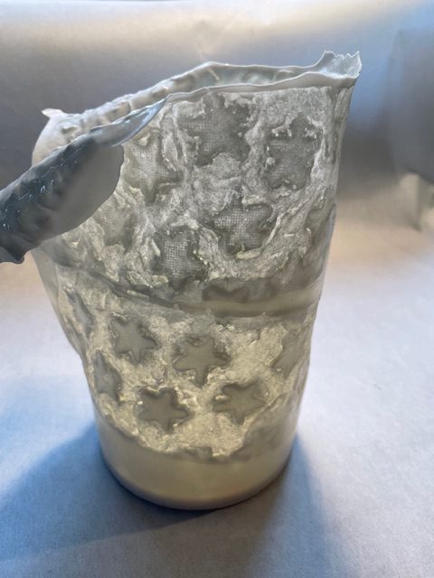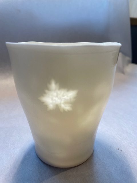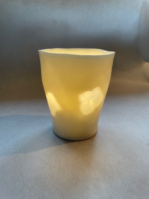Meine Lichtschalen aus Porzellan sind hochtransparent und hauchzart, die Blüten und Blätter sind aus meinem eigenen Garten oder im Wald gesammelt und dann gepresst, bevor ich sie verwende. Die linke Lichtvase ist aus Design-Papier, mit Sternen, Streifen oder Blumen – schau auch mal in meiner Galerie vorbei!